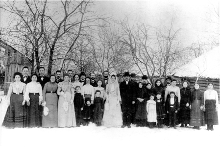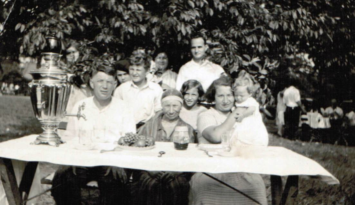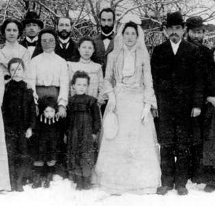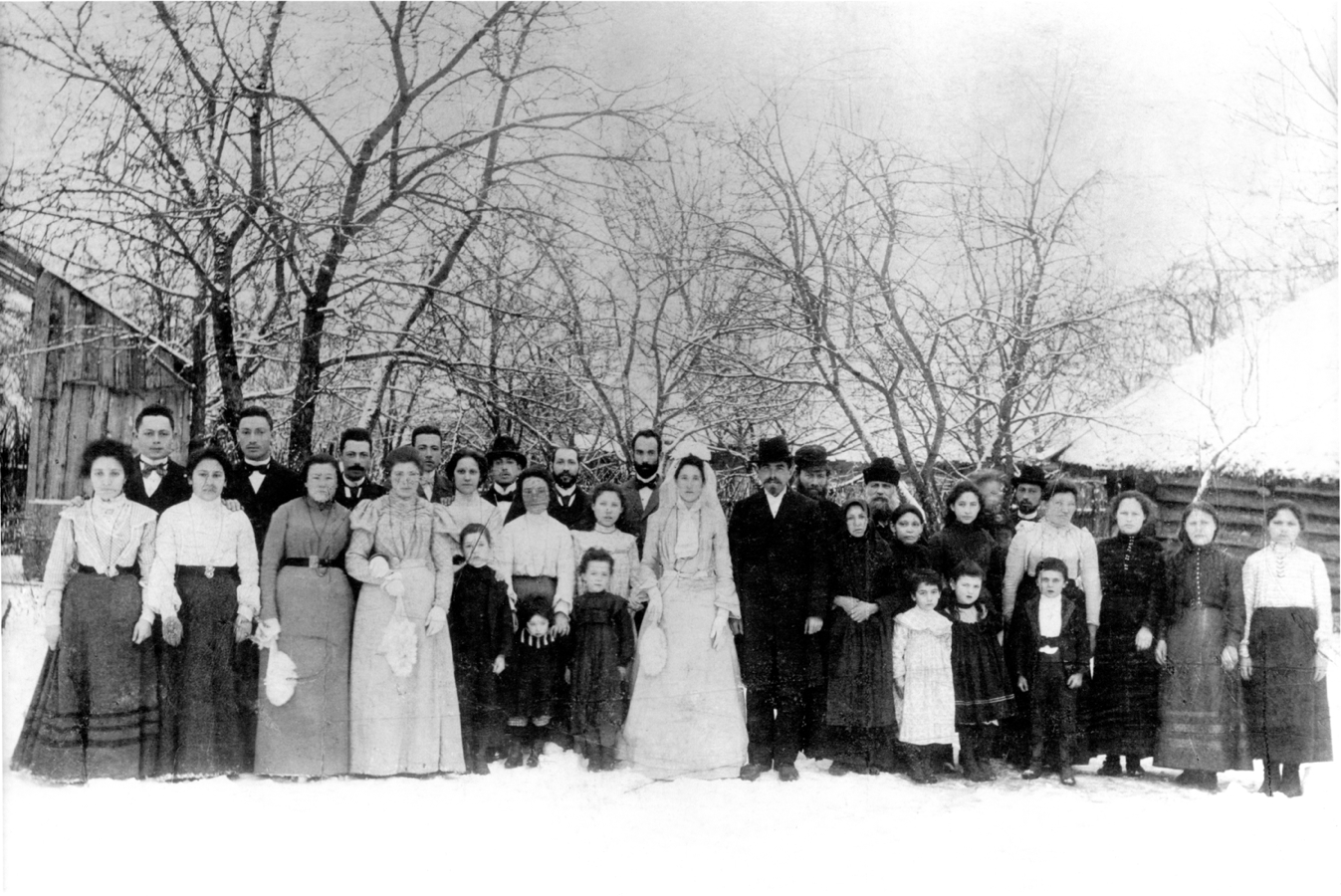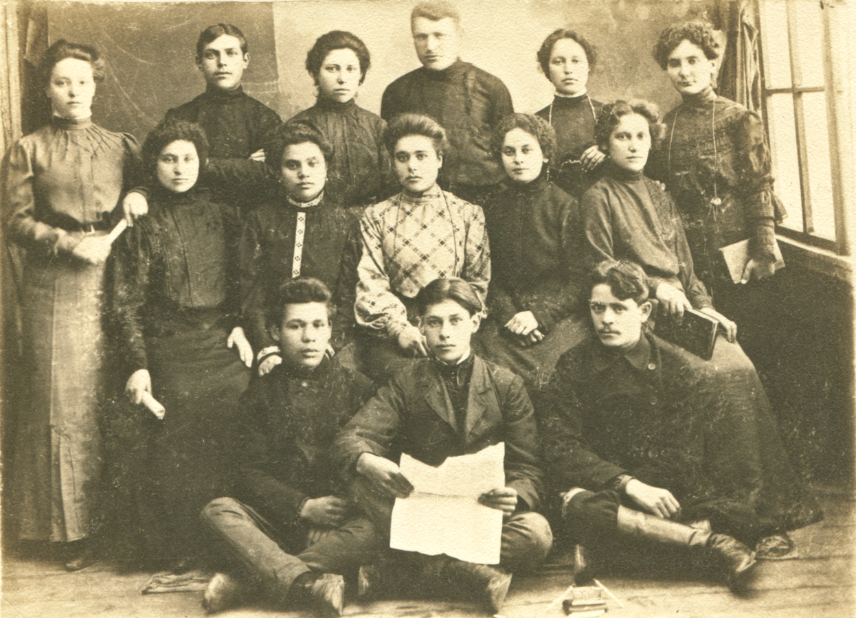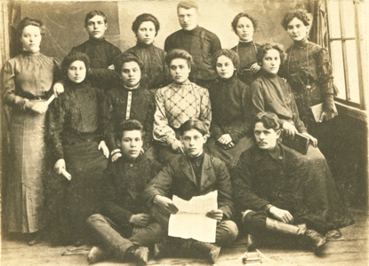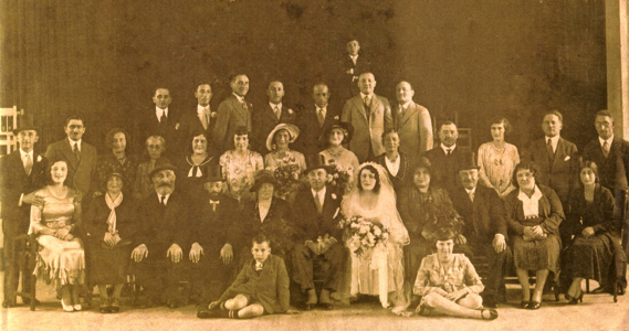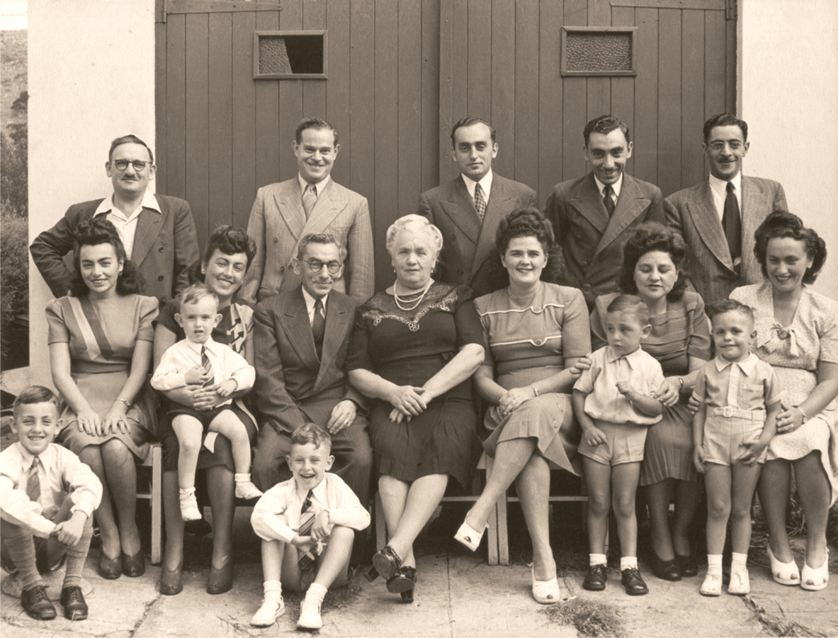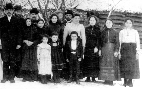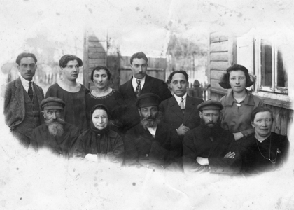 Seated: Sonia Sadur, Mrs Sadur, Mr Sadur, Elia Briss, Riva Briss, Mendel Bruss, Zelda Kavnat, Mrs Kavnat, Mr Kavnat, Mrs Galloon, Mary Miller (unrelated to other Millers).