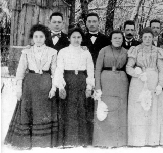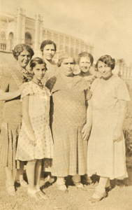 Left to right: Celia Glass, Clara Glass, Edith or possibly Jennie Glass, Sara Glass, Ethel Glass, and Mollie Wolk.