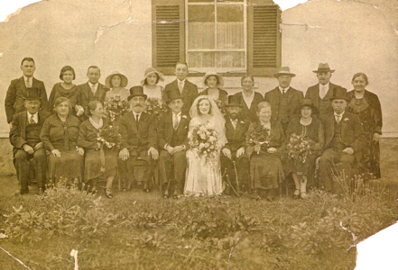 Next row standing: Sam Sadur, unknown, unknown, Mrs Annie Miller, Edith Hotz, Una Miller, unknown, unknown, Mrs Seper, Mr Seper, Sadie Poswell, Semach Galloon, Charley Poswell.